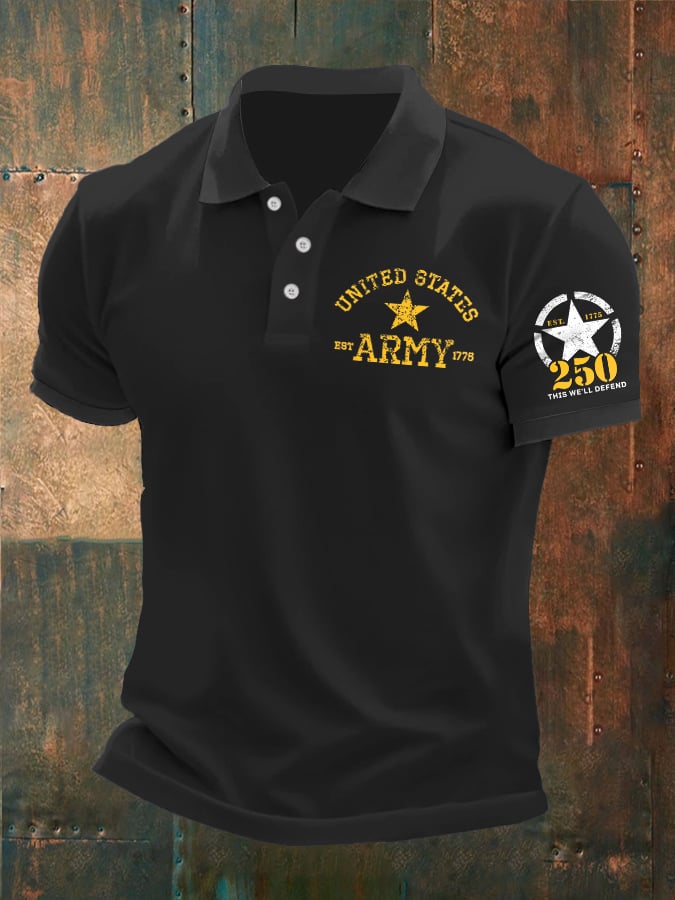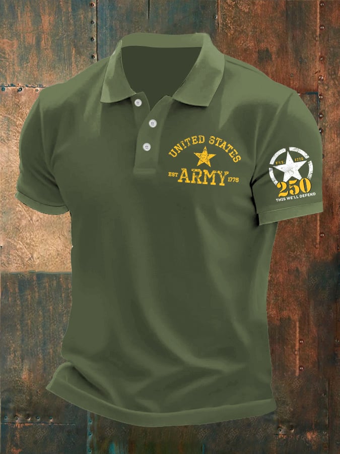 Man's Vintage Independence Day United States Army 250th Anniversary This We'll Defend Est.1775 Printed Polo Shirt