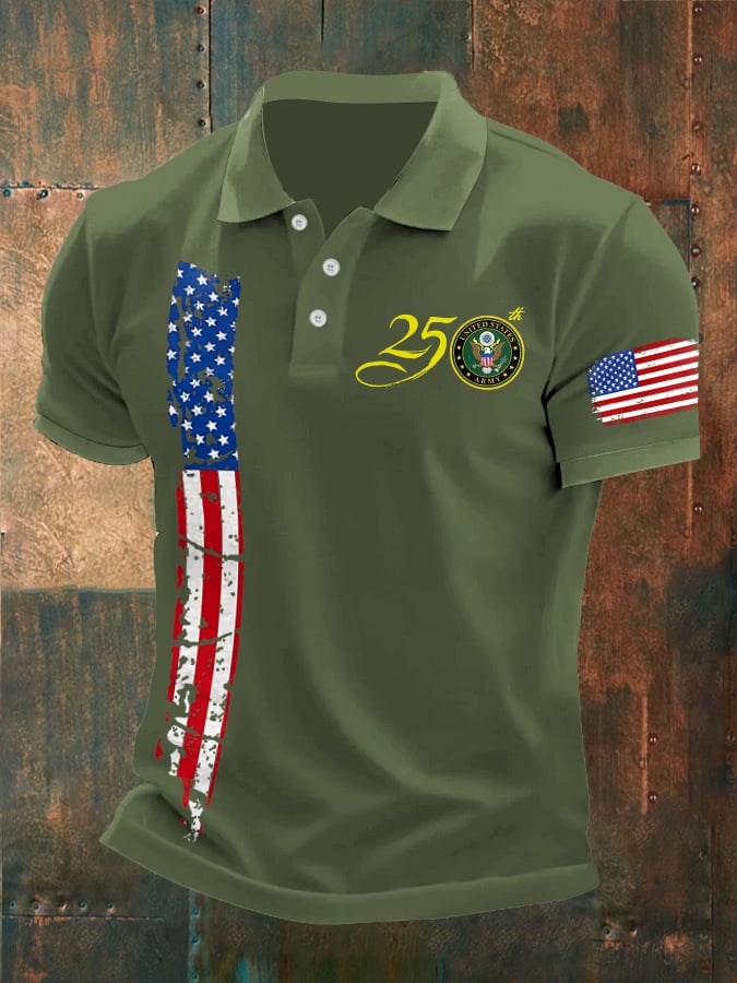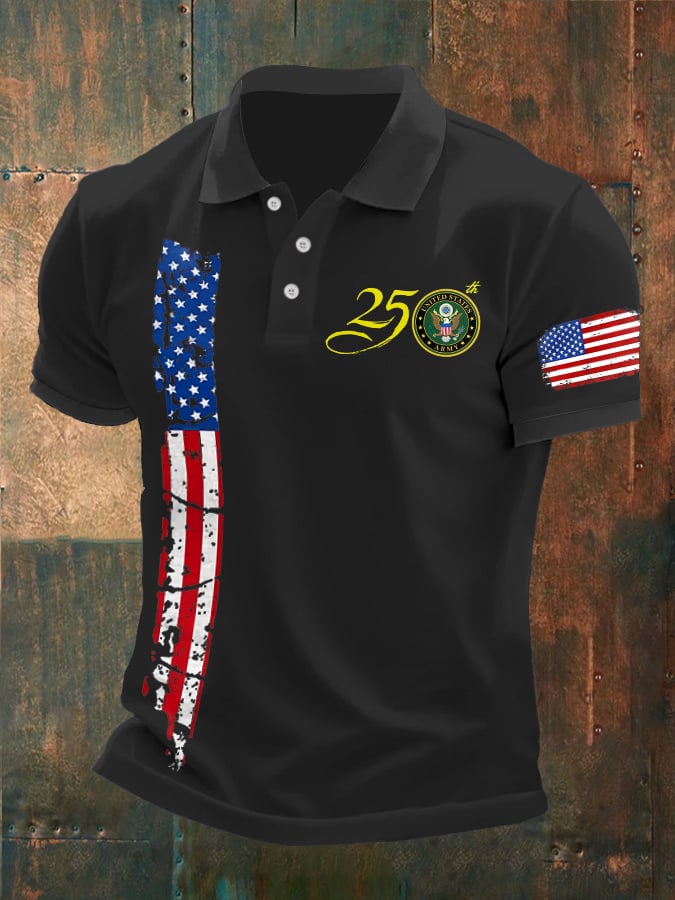 Man's Vintage Independence Day Flag United States Army 250th Anniversary Printed Polo Shirt