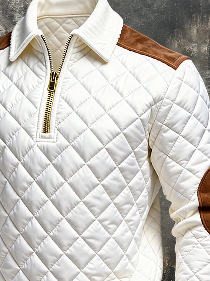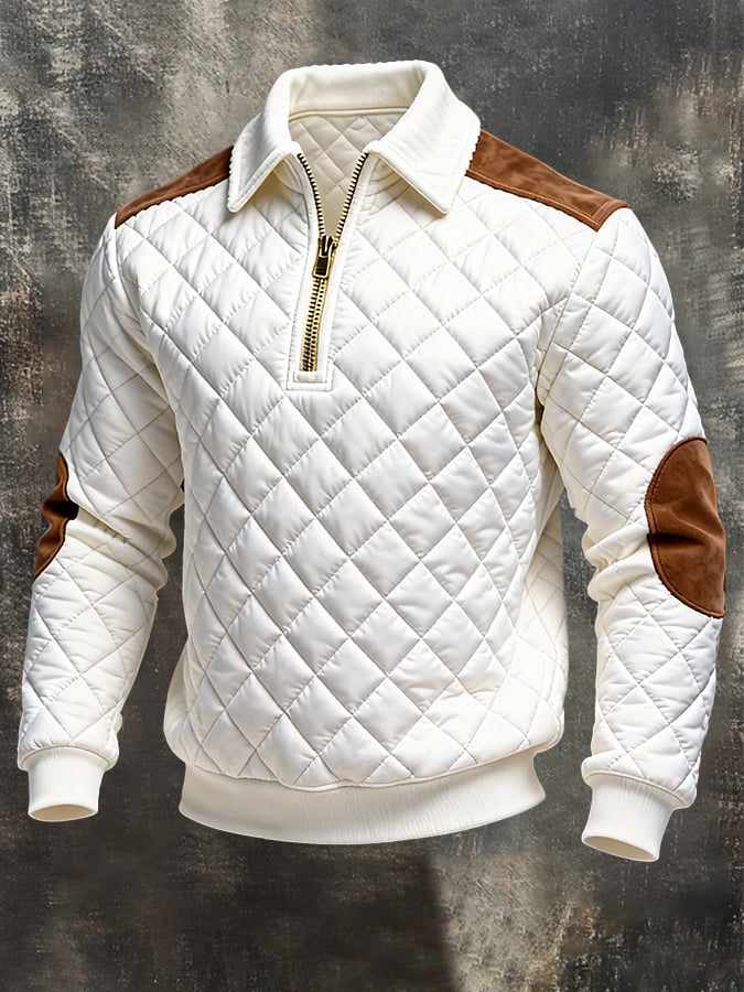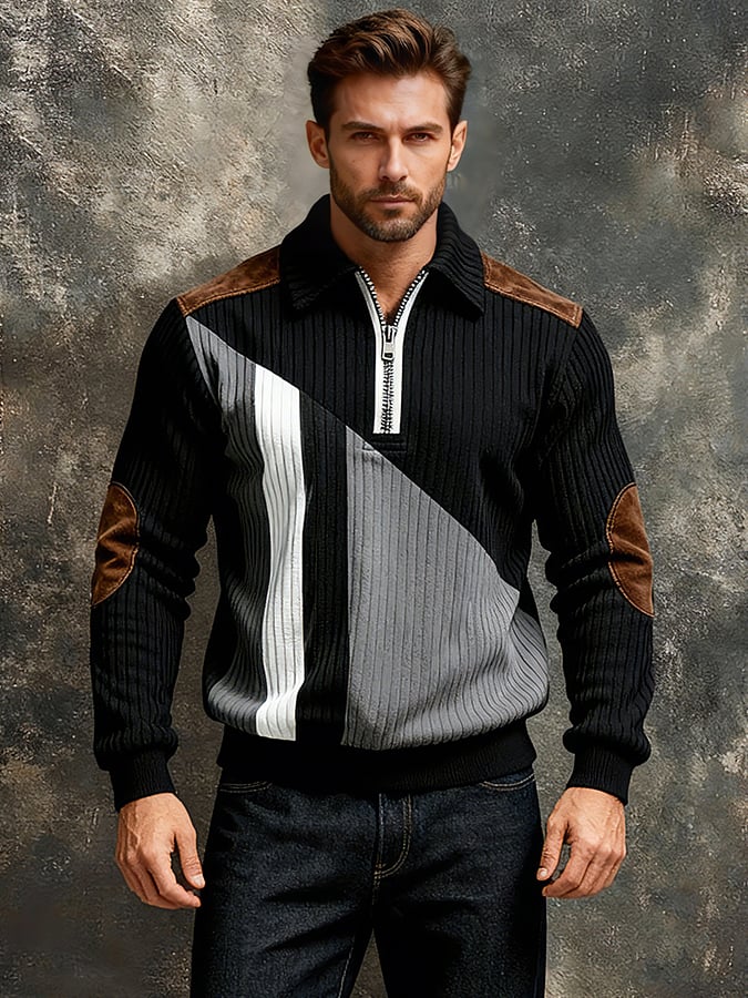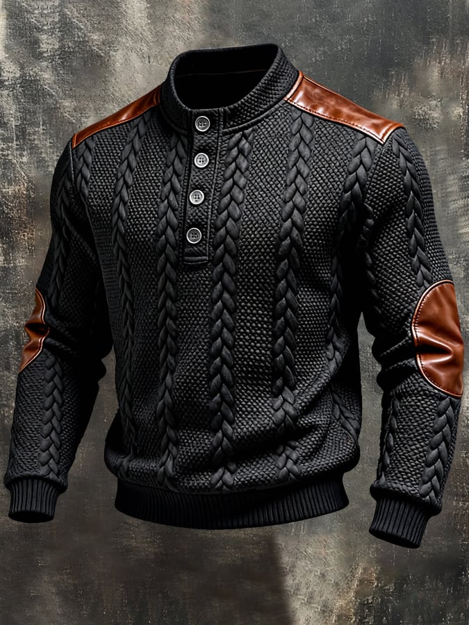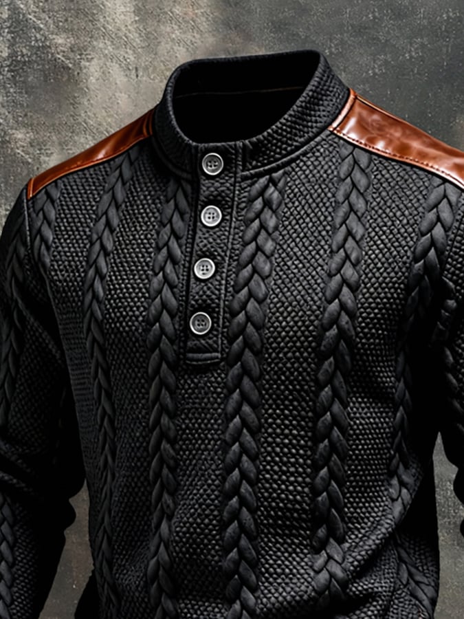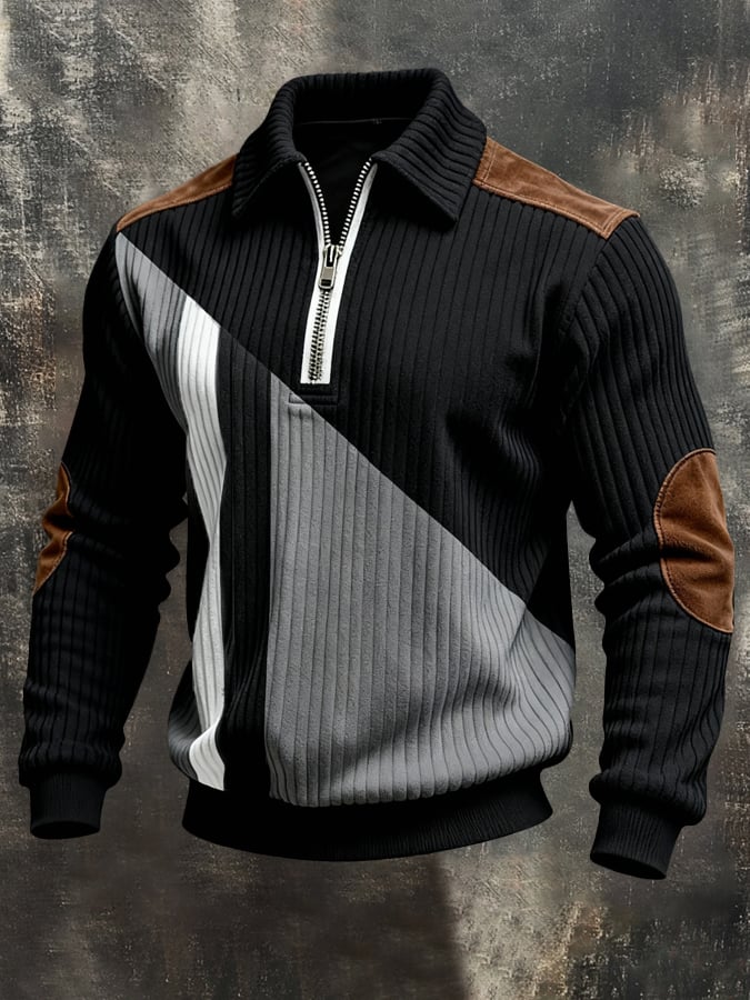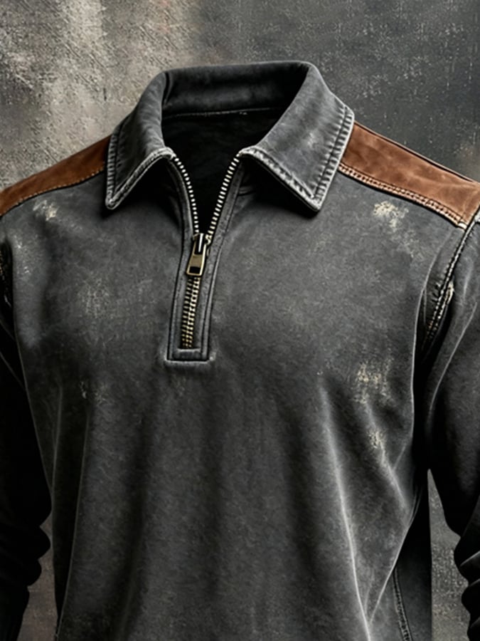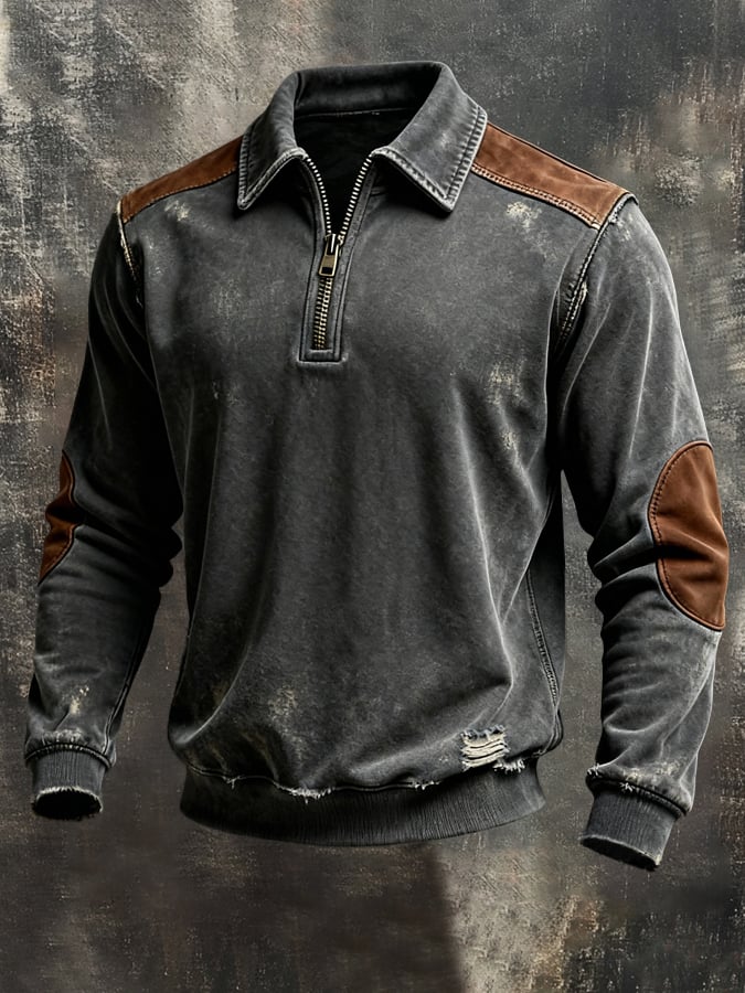Men'S Vintage-Style Textured Patchwork Color-Block Long-Sleeved Sweatshirt