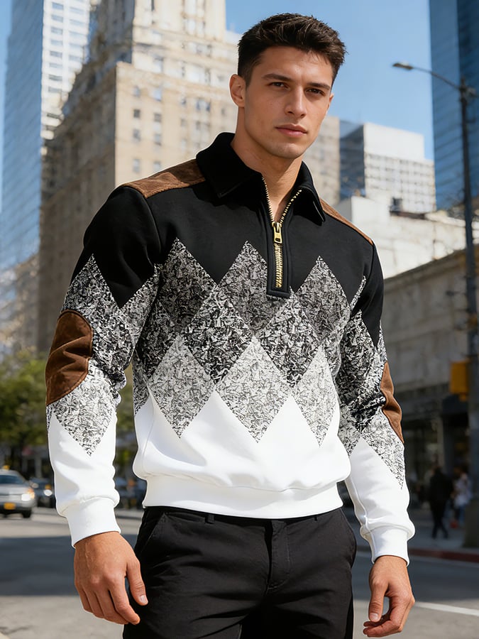 Men's Retro Color Block Print Zipper Sweatshirt