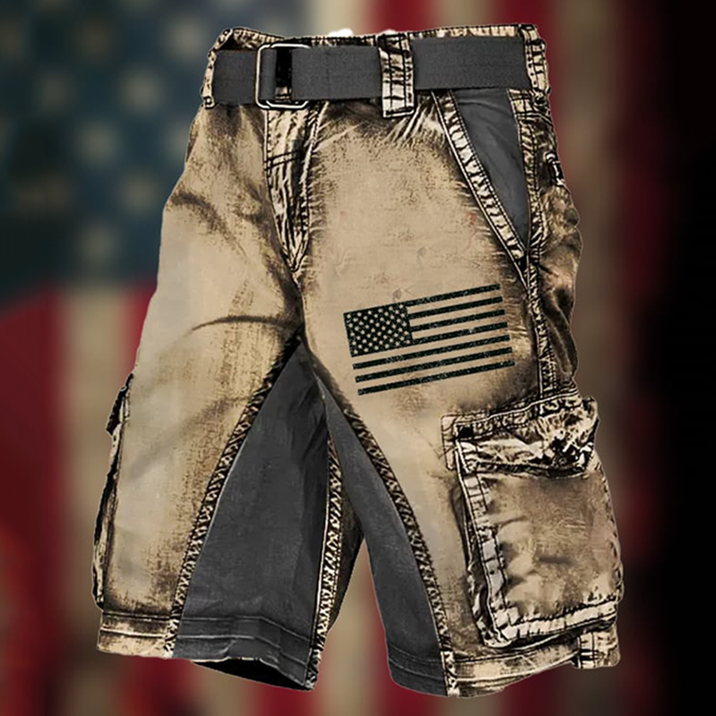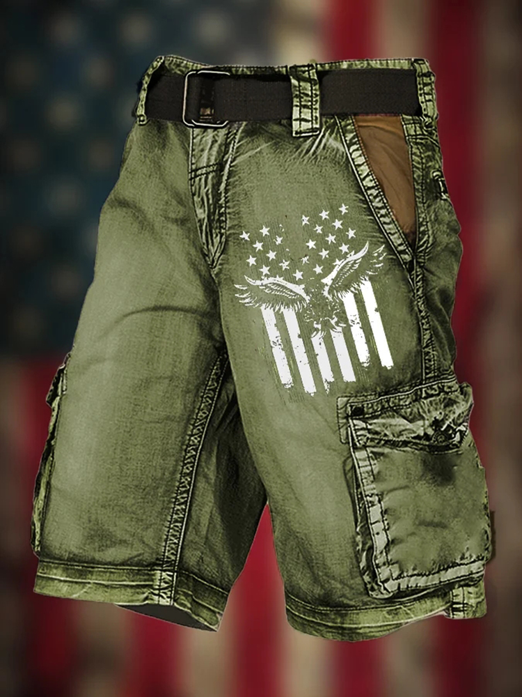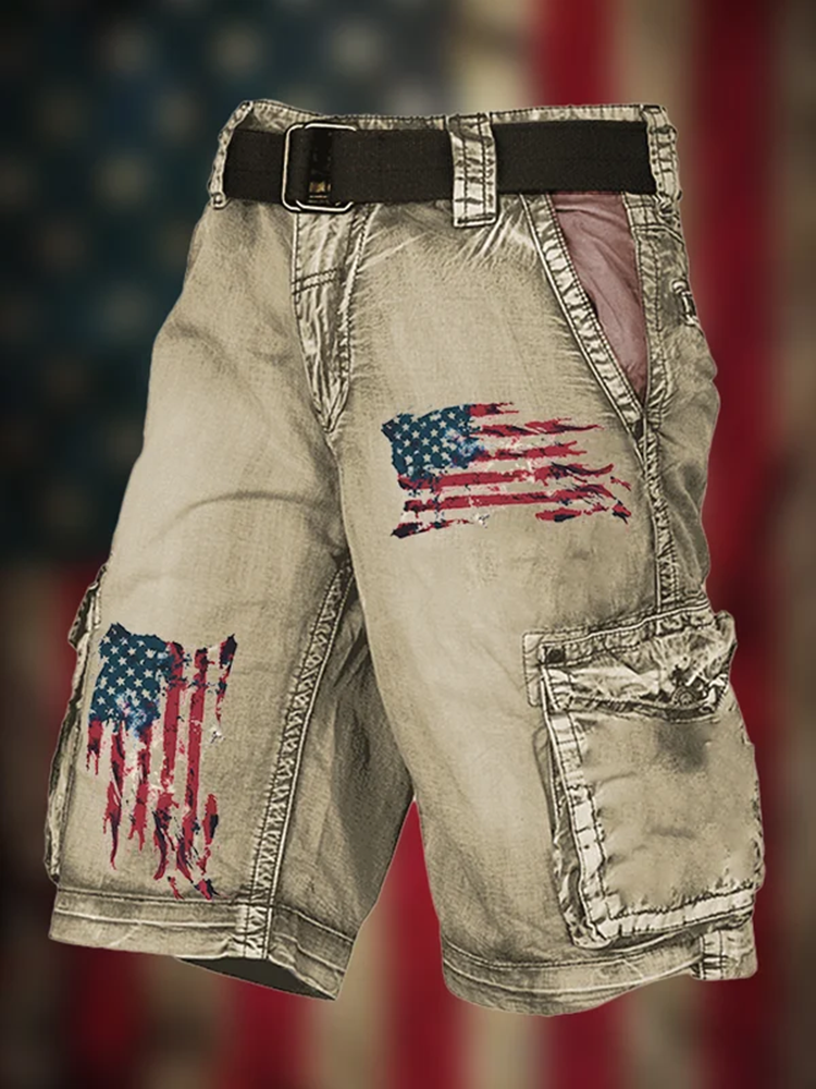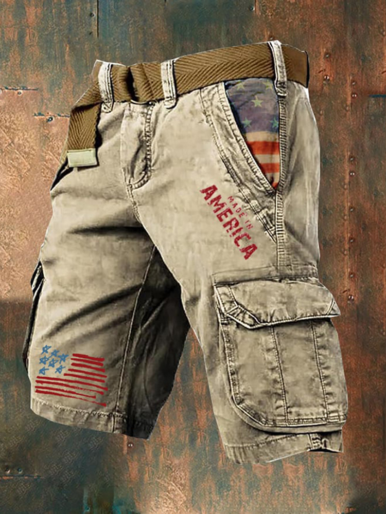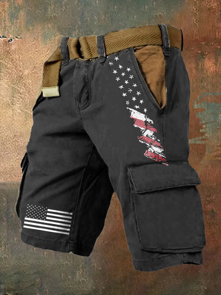 Men's Vintage Flag Independence Day Multi-Pocket Print Cargo Shorts (Belt Not Included)