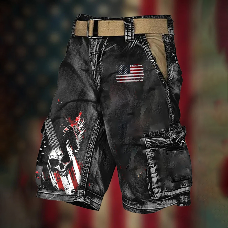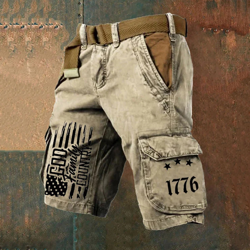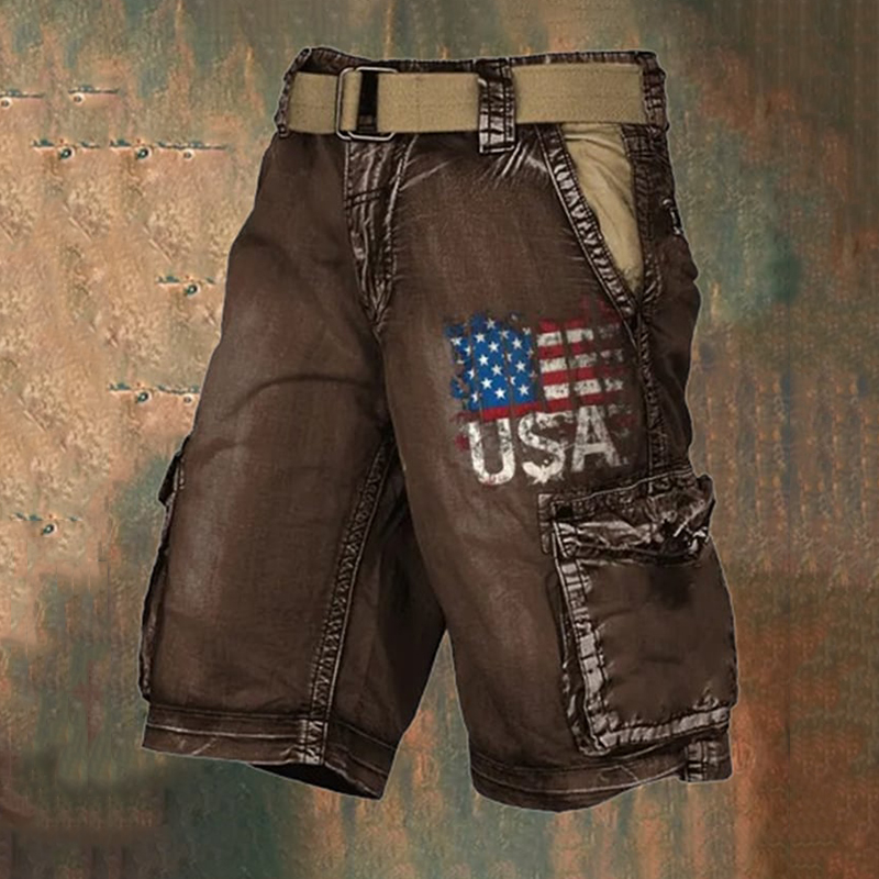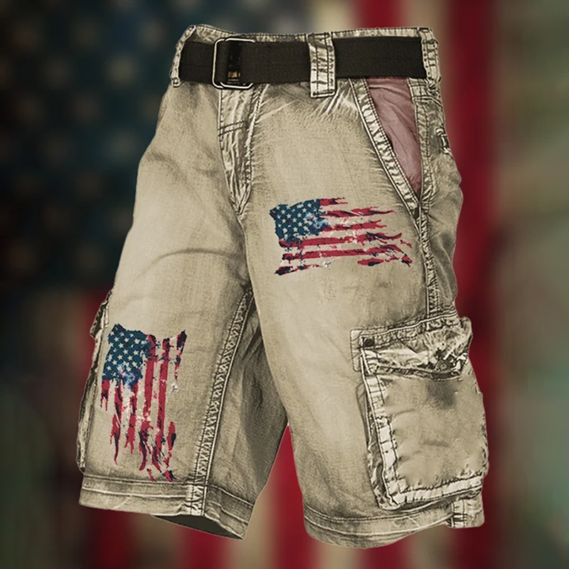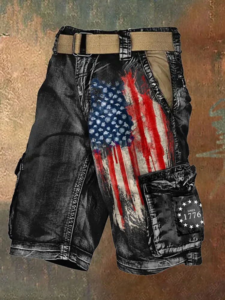 Men's Vintage Flag Independence Day Multi-Pocket Print Cargo Shorts (Belt Not Included)