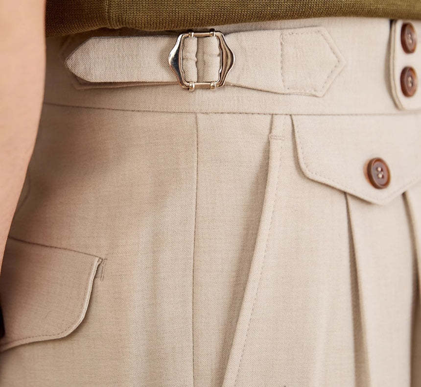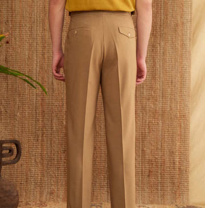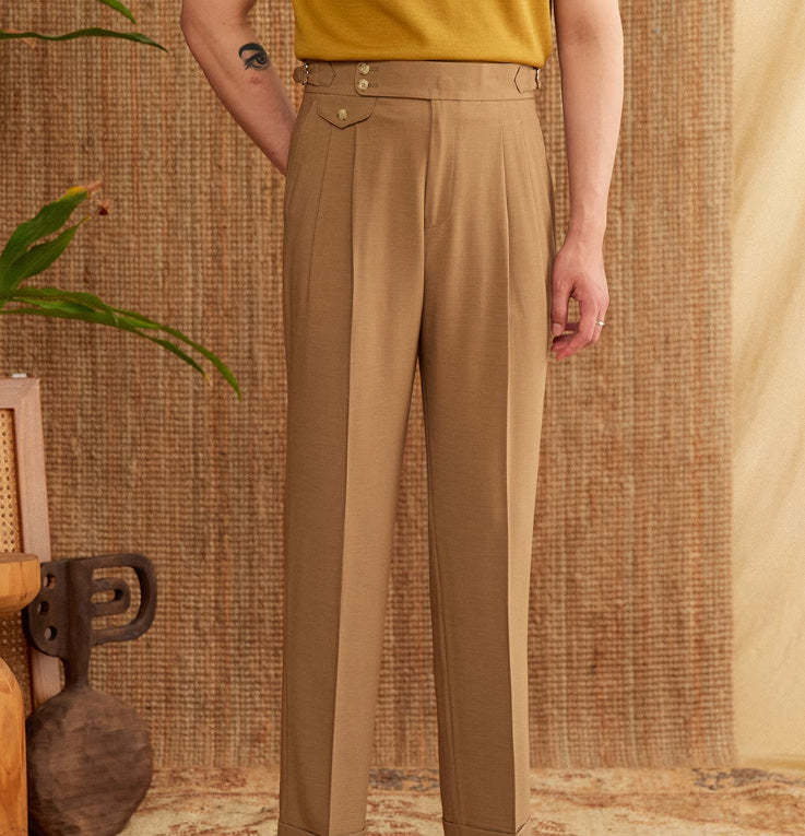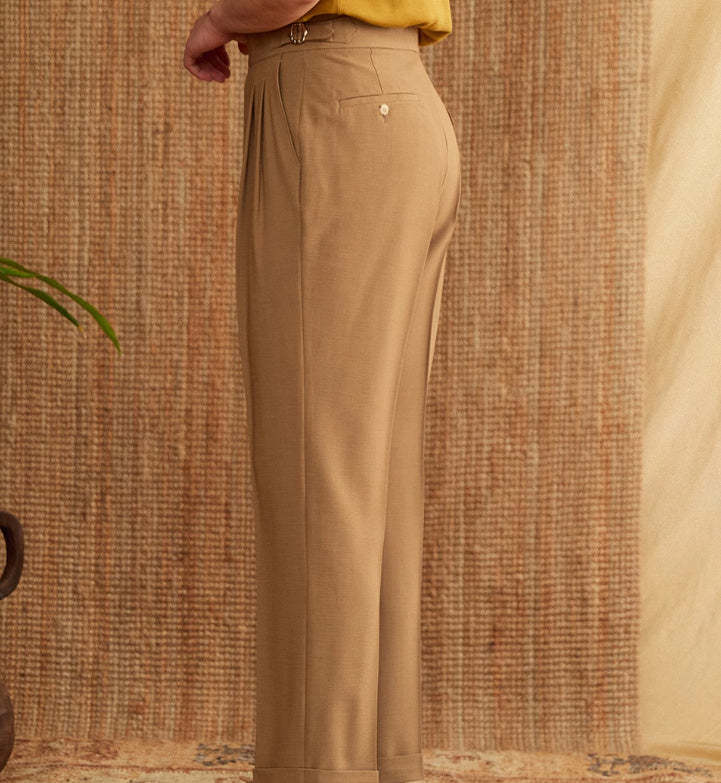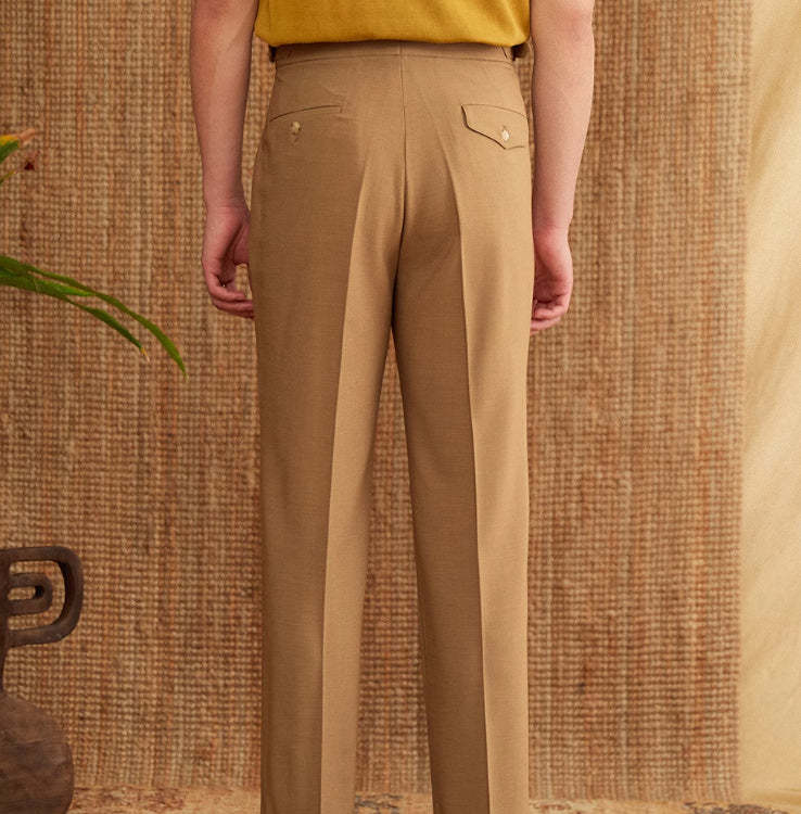 Porto Richezze's Catanzaro trousers offer a refined silhouette with their high waist and straight fit, accentuated by elegant double pleats. Featuring double buttons and side adjusters, these trousers provide a tailored, polished look. Crafted with attention to detail, including a subtle coin pocket, they blend sophistication with practicality for an effortlessly chic style.
