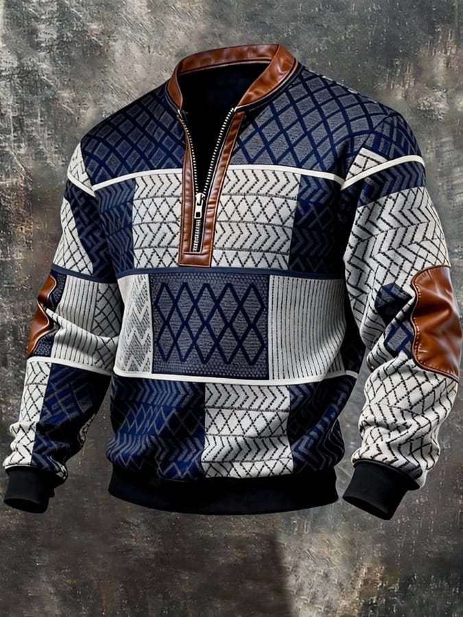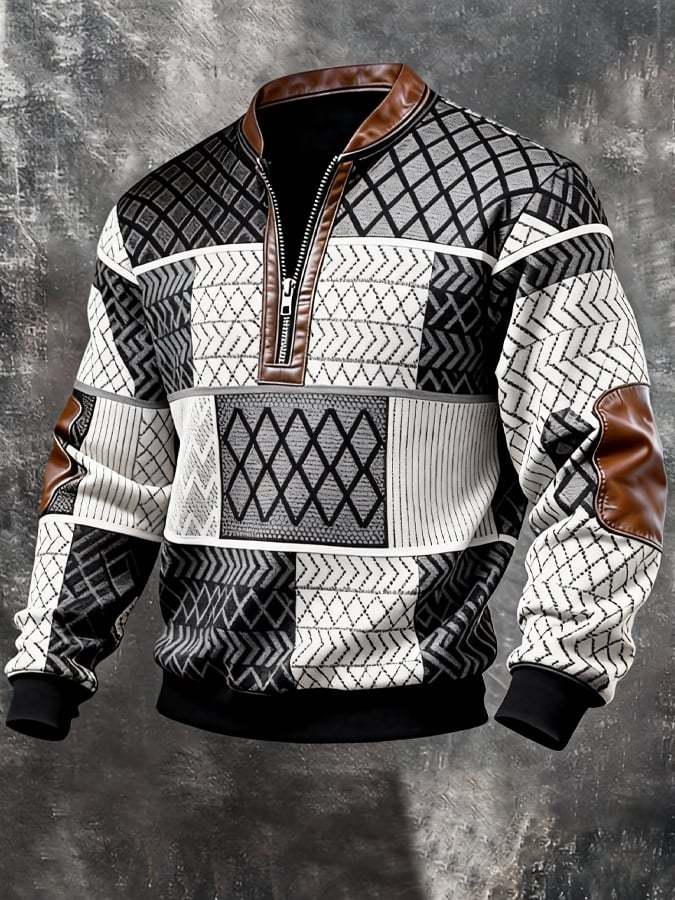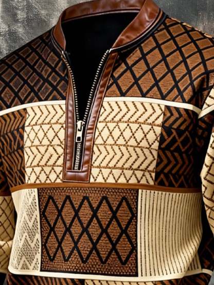 Men's Retro Color Block Print Zipper Sweatshirt