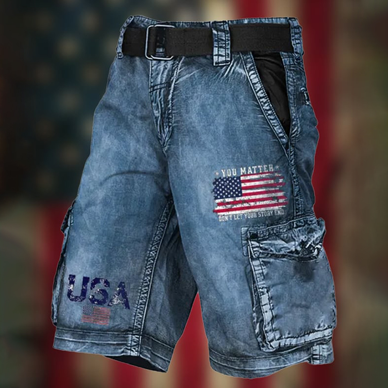 Men'S Vintage Flag Independence Day Multi-Pocket Print Cargo Shorts
