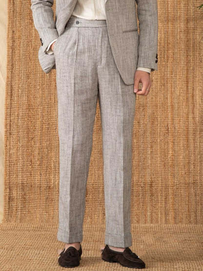 New York Cotton Linen Herringbone Straight Fit Pleated Trousers