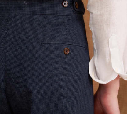 Elevate your wardrobe with Porto Richezze's Portovenere Seersucker Houndstooth High Waisted Trousers. Crafted from lightweight seersucker fabric featuring a classic houndstooth pattern, these trousers offer timeless elegance combined with Italian tailoring precision. The high waist silhouette flatters your figure, while the hook Gurkha closure adds a refined touch of sophistication. Perfect for those who appreciate unique and chic style with exceptional comfort.