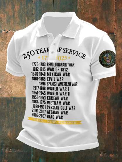 Vintage Men's United States Army 250 Years Of Service 1775-2025 Then - Now - Forever Printed Polo Shirt